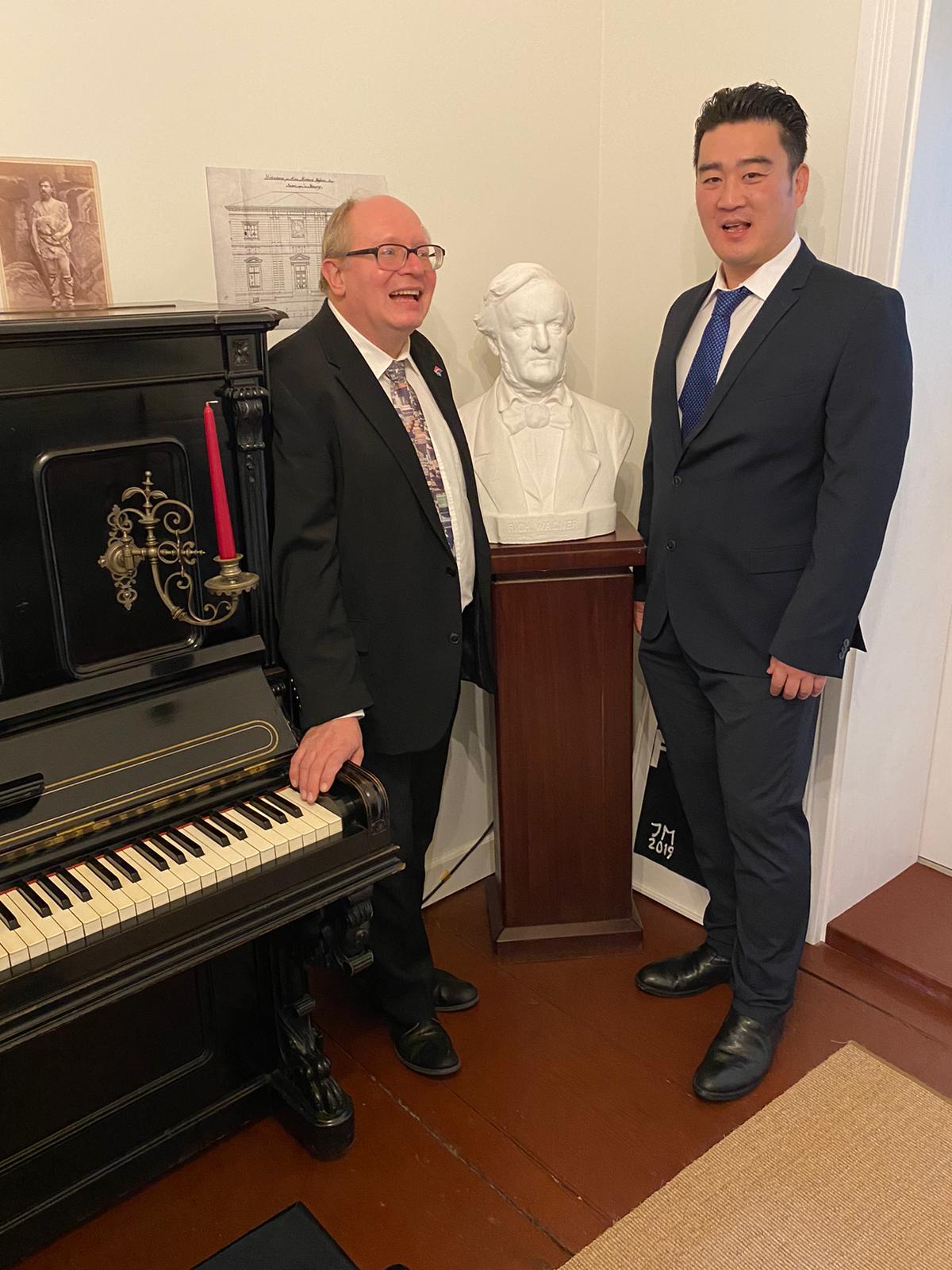 Im Rahmen des Jubiläums "150 Jahre Richard Wagner in Bayreuth" fand am 2. Oktober ein festliches Konzert im "Wagnerzimmer" des ehemaligen Hotel Fantaisie statt, dem ersten Domizil der Familie Wagner nach der Übersiedelung aus Tribschen. Der Auftritt am authentischen Ort ging auf eine Initiative von Karsten Huschke zurück, der Kapellmeister am Theater Koblenz sowie Ehrenmitglied des dortigen Richard-Wagner-Verband ist. Er begleitete auf einem historischen Klavier den profilierten Wagner-Bassisten Jongmin Lim bei seinem begeisternden Vortrag im benachbarten "Komponierzimmer". Hier schloss Richard Wagner die Orchesterskizze zur Götterdämmerung am 6. Juni 1872 ab: "Alles Coseln zu Ehren" steht in der Partitur.