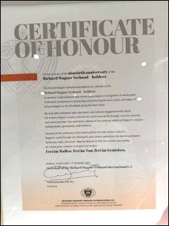 Ehrengast Harry Leutscher, Präsident von Wagnerverband International, erinnerte in einer Ehrenurkunde für den Koblenzer Verband nochmals an das 90jährige Bestehen und an das fortgsetzte kulturelle Engagement. Koblenz fand sich darin liebenswürdig poetisch verklärt: "Gelegen am Zusammenfluss von Rhein und Mosel, immer verbunden mit Wagners Welt durch 'Das Rheingold', symbolisiert Ihr Verband die Harmonie zwischen Landschaft, Mythos und Musik."