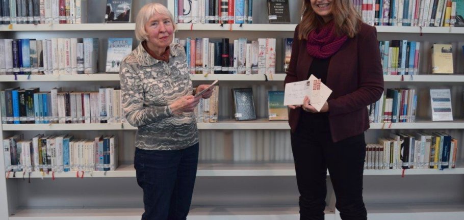Foto (Stadt Koblenz): Edda Dörr-Wessels (li.) übergibt Originaldokumente von bzw. über Fritz von Unruh an die Leiterin der StadtBibliothek Koblenz, Susanne Ott.
